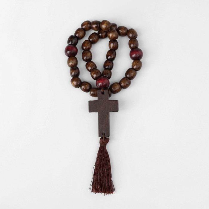 Православные чётки изготовлены из дерева, имеют 33 бусины и подвеску-крест с текстильной кистью. Аксессуар предназначен для достижения концентрации и покоя во время медитации, также часто используется как стильное украшение на зеркало машины.