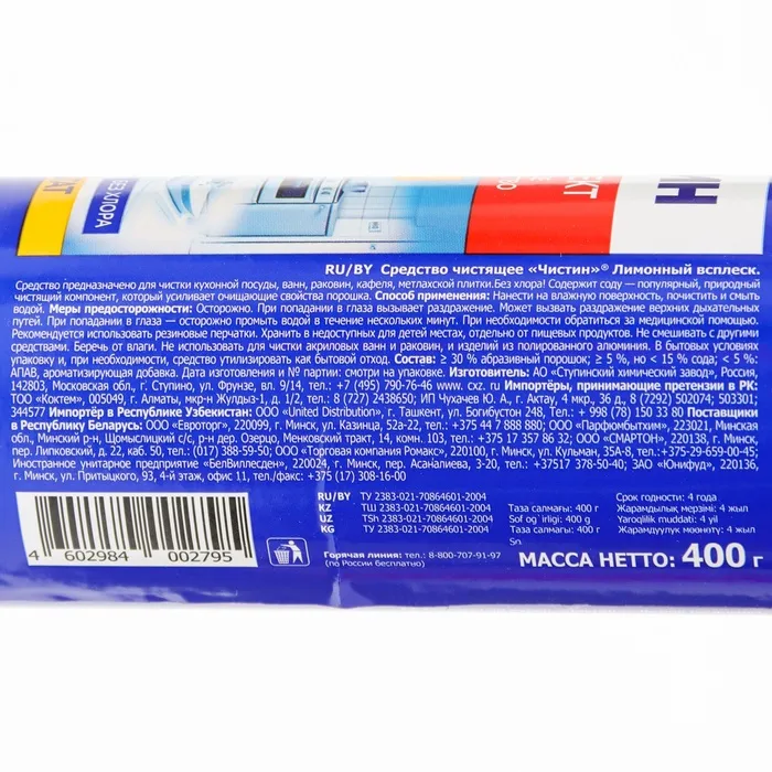 Способ применения: Нанести на влажную поверхность, почистить и смыть водой.