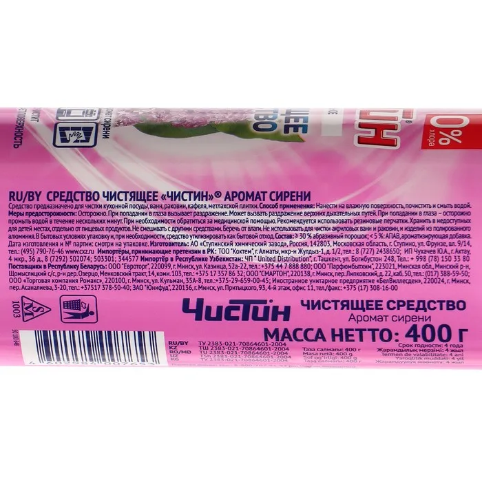 стойкими загрязнениями. Экономичен в употреблении. Предназначен для очистки плитки, ванны, раковины, плиты, посуды и т.д.