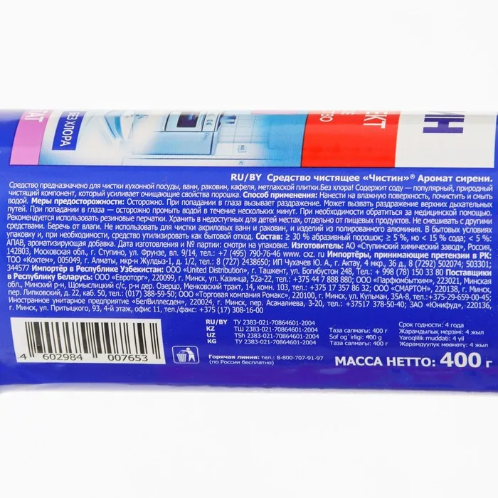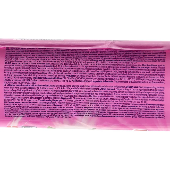 Состав: >30 % аброзивный порошок ,< 5 % АПАВ, ароматизирующая добавка.