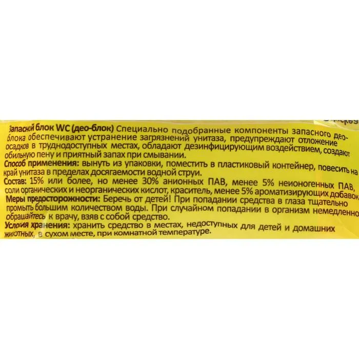Специально подобранные компоненты запасного део-блока обеспечивают устранение загрязнений унитаза, предупреждают отложение осадков в труднодоступных местах, обладают дезинфицирующим воздействием, создают обильную пену и приятный запах при смывании.