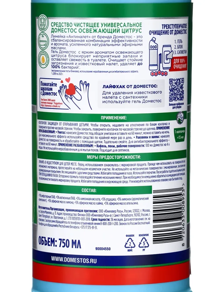 Универсальное чистящее средство Domestos «Освежающий цитрус» - это густое и экономичное средство, которое имеет гелевую текстуру и помогает устранять неприятные запахи, бактерии, грибки, вирусы и споры во всем доме.
