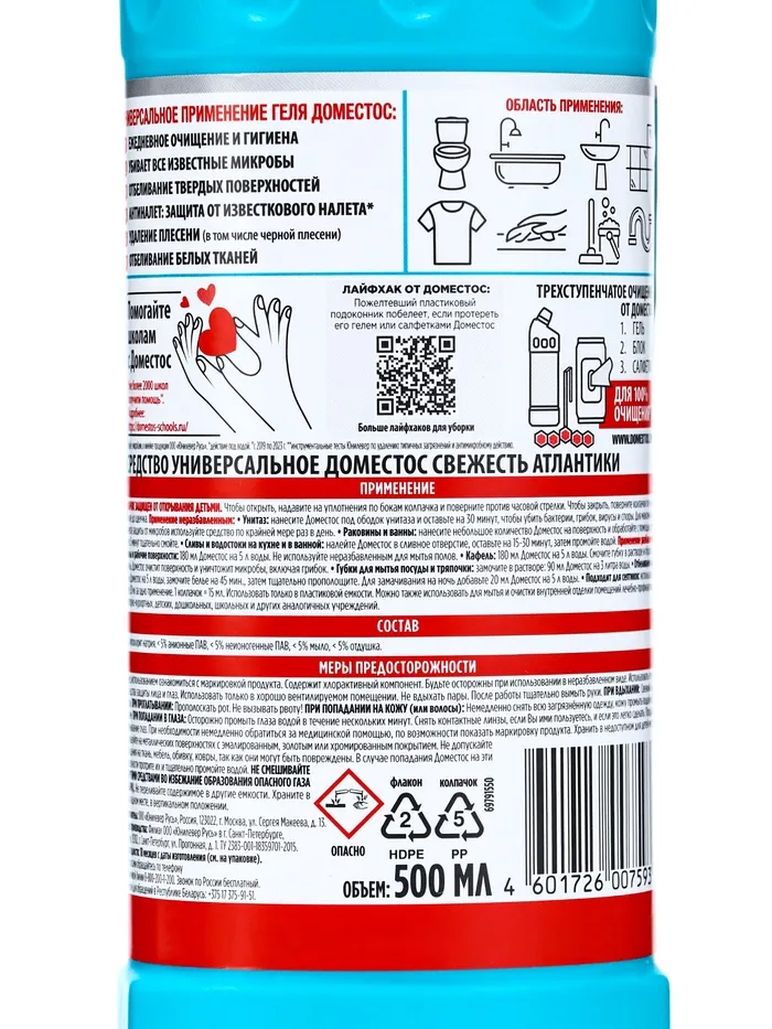 Способ применения: для ванны, унитаза и других поверхностей в неразбавленном виде: нанесите под ободок унитаза - оставьте на продолжительное время или на ночь, смойте водой, нанесите на поверхность раковины или ванны, обработайте с помощью щетки, через 5 минут тщательно смойте. Сливное отверстие - оставьте на 5 минут, затем промойте водой. Применение в разбавленном виде - 4 колпачка на 5 л воды для мытья полов. Рабочие поверхности кафеля 2 колпачка геля на 3 литра воды для обработки губок для мытья посуды.