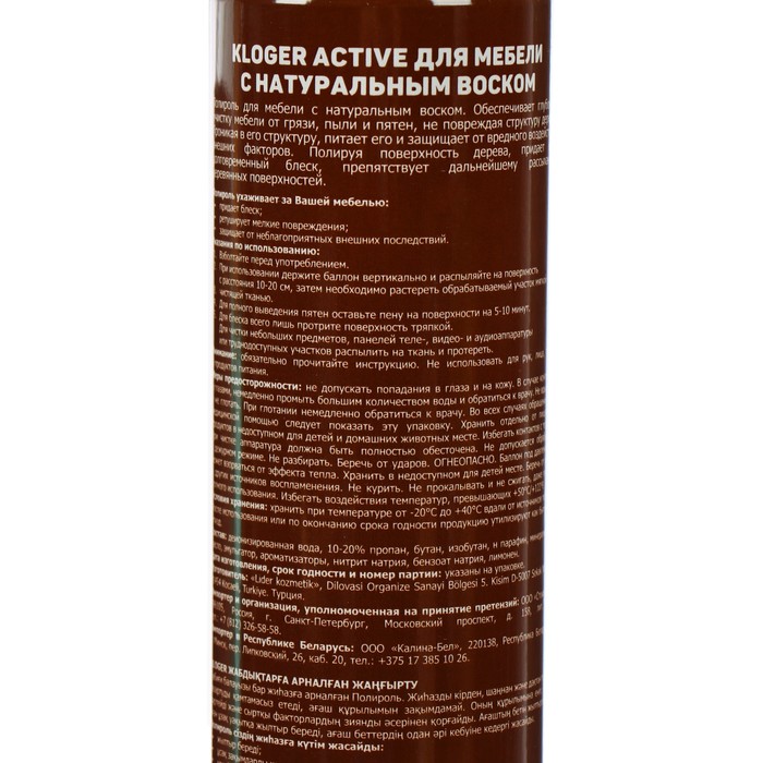 Полироль для мебели с натуральным воском. Обеспечивает глубокую чистку мебели от грязи, пыли, пятен, не повреждая структуру дерева проникая в его структуру, питает и защищает от вредного воздействия внешних факторов. Полируя поверхность дерева, придает долговременный блеск, препятствует дальнейшему рассыханию деревянных поверхностей.