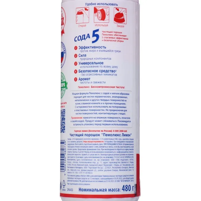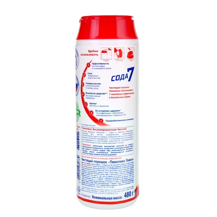 Мощная формула Пемолюкс с содой и мягким абразивом подходит для чистки керамических, эмалированных, металлических и других твердых поверхностей на кухне, в ванной комнате и прочих помещениях. С осторожностью использовать на полированных и пластиковых поверхностях. Не предназначен для чистки поверхностей, контактирующих с пищей.