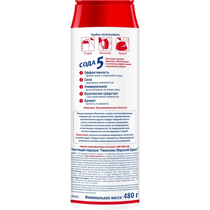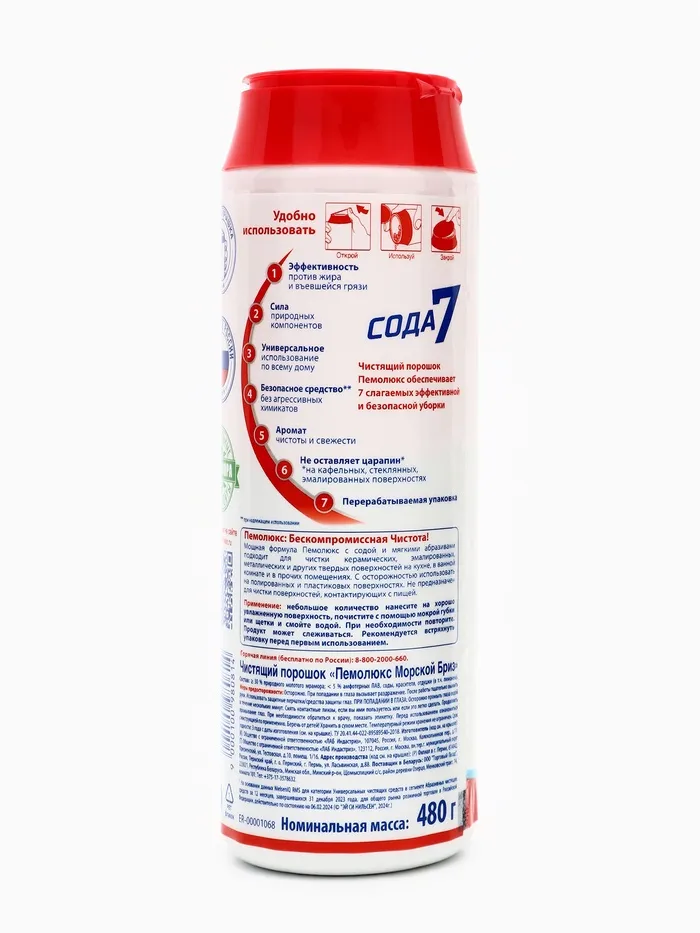 Мощная формула Пемолюкс с содой и мягким абразивом подходит для чистки керамических, эмалированных, металлических и других твердых поверхностей на кухне, в ванной комнате и прочих помещениях. С осторожностью использовать на полированных и пластиковых поверхностях. Не предназначен для чистки поверхностей, контактирующих с пищей.