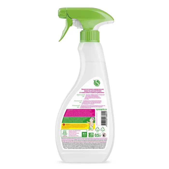 Биоразлагаемое универсальное средство для сантехники SYNERGETIC - концентрированное чистящее средство для ежедневной уборки поверхностей, устойчивых к кислотным моющим средствам, в ванных комнатах и санузлах: унитаза, раковины, ванны, душевой кабины, керамической плитки, акриловых, фаянсовых и эмалированных поверхностей. Комплекс натуральных кислот (лимонной, гликолевой и молочной) и Н-тензидов, полученных из растительного масла, устраняет известковый налёт, ржавчину, камень и минеральные загрязнения даже в холодной и жесткой воде. Средство с антибактериальным эффектом убивает микробы и бактерии, а также эффективно устраняет неприятные запахи. Гипоаллергенная парфюмерная композиция с маслами сантала, бергамота, мяты и лимона оставляет свежий аромат. Международный экологический сертификат ICEA подтверждает биоразлагаемость, безопасность и эффективность средства. Средство полностью смывается водой, не содержит хлор, фосфаты, оптические отбеливатели, SLS, SLES, агрессивные кислоты и ПАВ. Биоразлагаемые компоненты не вредят микрофлоре септических установок. Нанести на обрабатываемую поверхность, выдержать 10 - 15 минут, почистить, смыть водой. Хранить отдельно от пищевых продуктов, в местах, недоступных для детей и животных. Избегать попадания в глаза, рот и на повреждённые участки кожи. В случае попадания обильно промыть водой и обратиться за медицинской помощью. Использовать перчатки. Не смешивать с другими средствами бытовой химии. Использовать строго по назначению. Не использовать на горячих и повреждённых поверхностях; поверхностях из мрамора и цветных металлов; деревянных поверхностях. Перед применением проверить совместимость средства с обрабатываемой поверхностью на небольшом незаметном участке. Подготовленная вода > 30%; комплекс биоразлагаемых кислот (гликолевая, лимонная, молочная) 5–15%; комплекс биоразлагаемых Н-тензидов (ПАВ из растительного масла) < 5%; загуститель (ксантановая камедь) < 5%; гипоаллергенная парфюмерная композиция с маслами лаванды, шалфея, бергамота < 0,5%; пищевой краситель < 0,5%.