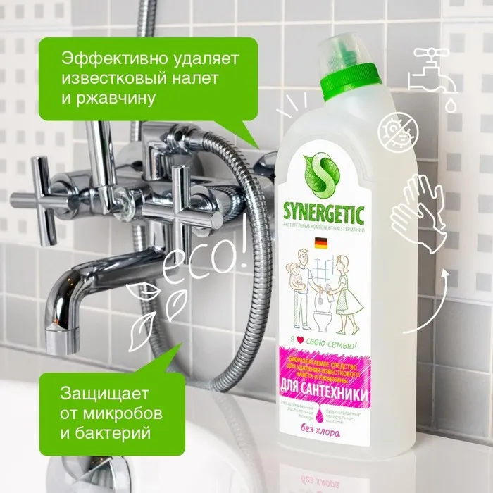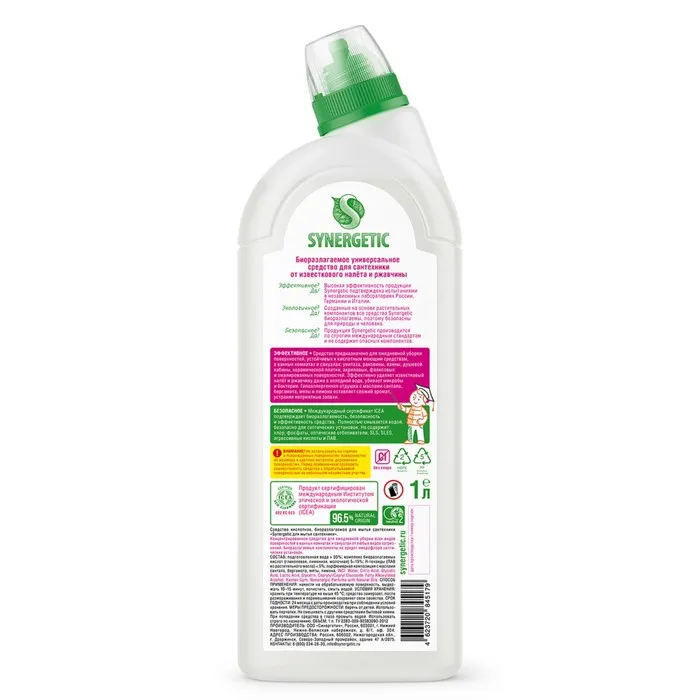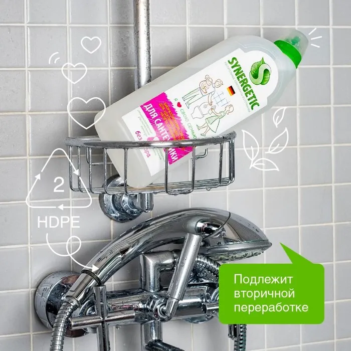 Биоразлагаемое универсальное средство для сантехники SYNERGETIC - концентрированное чистящее средство для ежедневной уборки поверхностей, устойчивых к кислотным моющим средствам, в ванных комнатах и санузлах: унитаза, раковины, ванны, душевой кабины, керамической плитки, акриловых, фаянсовых и эмалированных поверхностей.