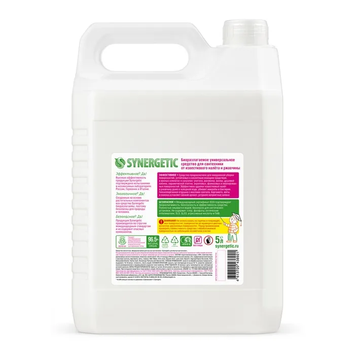 Биоразлагаемое универсальное средство для сантехники SYNERGETIC - концентрированное чистящее средство для ежедневной уборки поверхностей, устойчивых к кислотным моющим средствам, в ванных комнатах и санузлах: унитаза, раковины, ванны, душевой кабины, керамической плитки, акриловых, фаянсовых и эмалированных поверхностей.