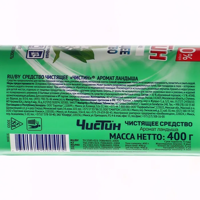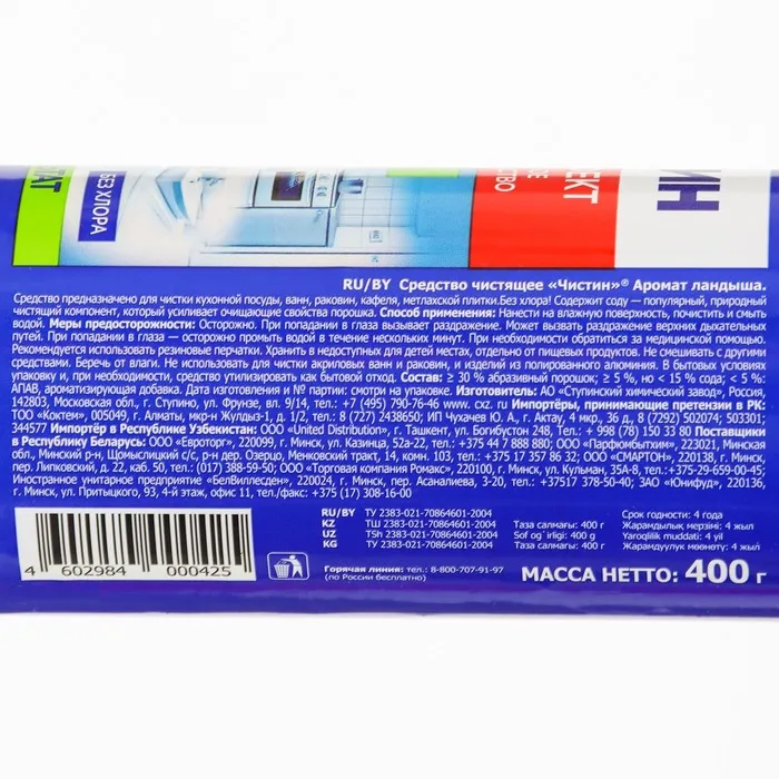 Способ применения: Нанести на влажную поверхность, почистить и смыть водой.