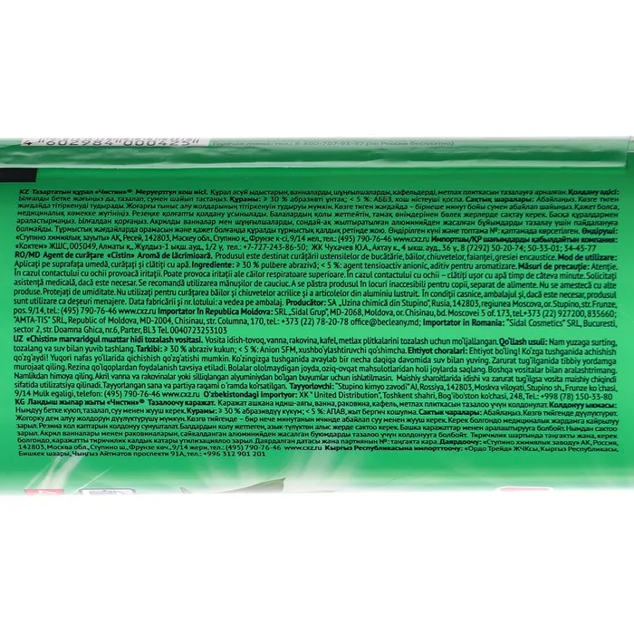 Состав: 30 % абразивный порошок, < 5 %: АПАВ, ароматизирующая добавка.
