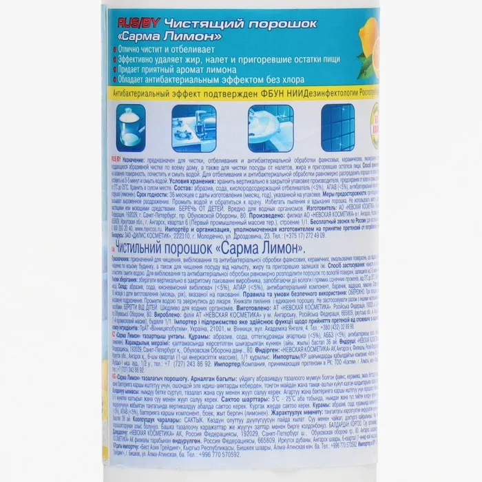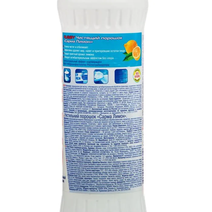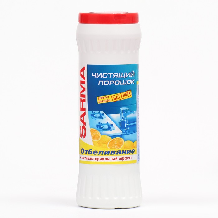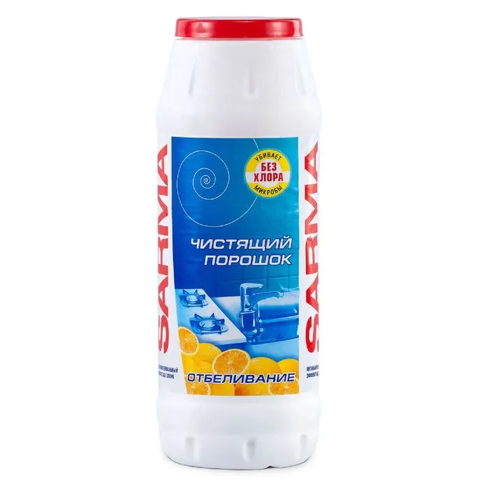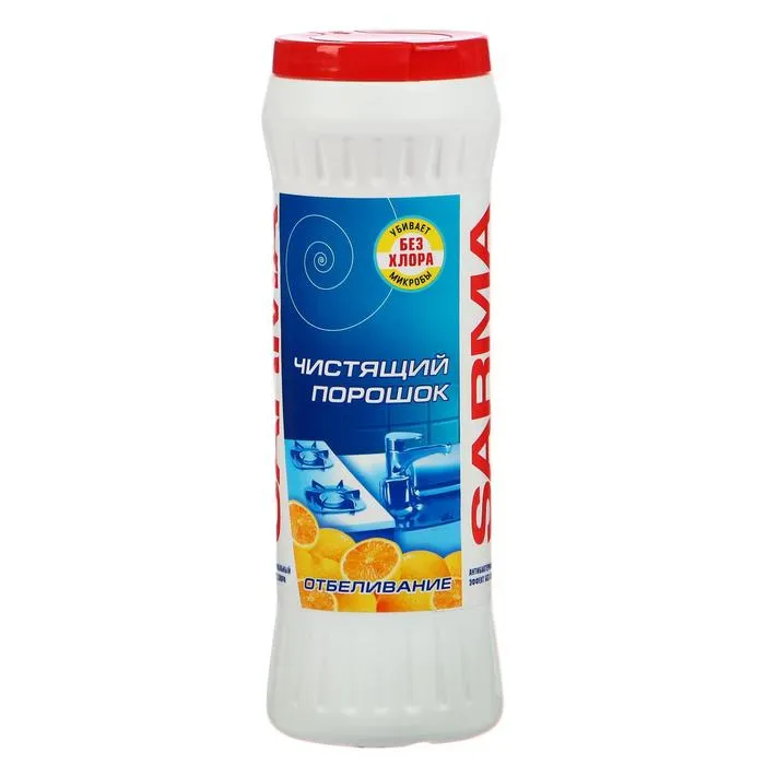 Чистящий порошок Sarma «Отбеливание» прекрасно очищает посуду от налёта, жира и пригоревших остатков пищи и при этом не содержит хлора.
