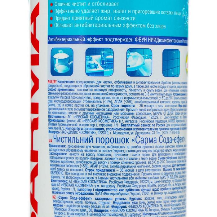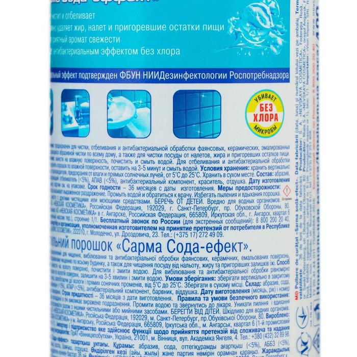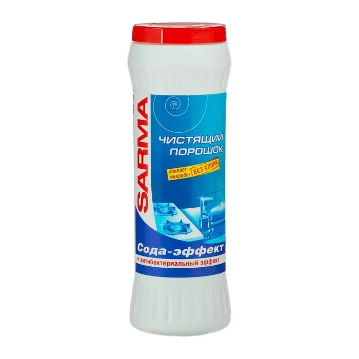 Чистящий порошок Sarma «Сода-эффект» прекрасно очищает посуду от налёта, жира и пригоревших остатков пищи и при этом не содержит хлора.