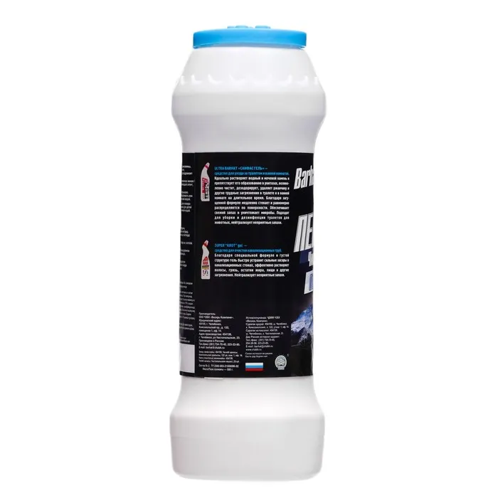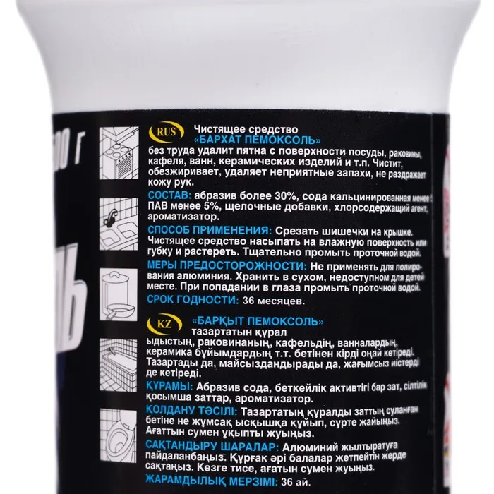 Чистящие средство, порошок. Без труда удалит пятна с поверхности посуды, раковины, кафеля, ванн, керамических изделий и т. д. Чистит и обезжиривает, удаляет неприятные запахи, не раздражает кожу рук.