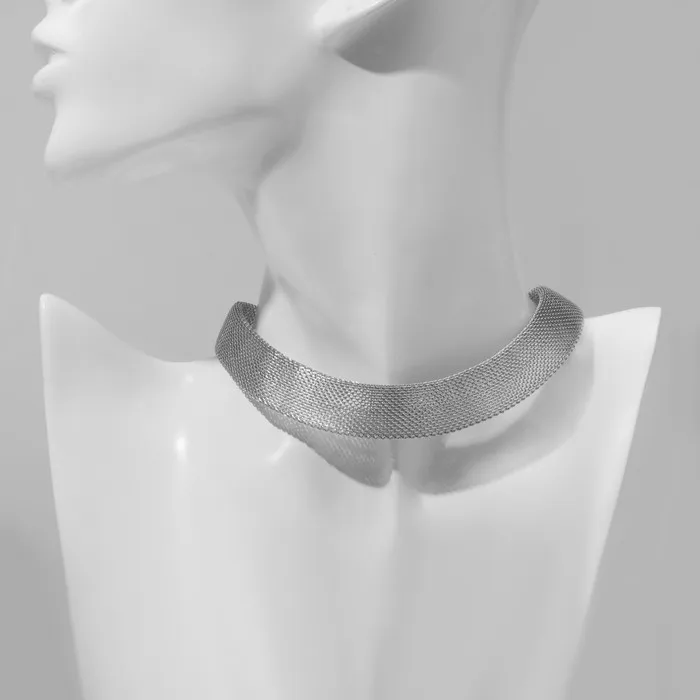 Этот чокер сочетает в себе простоту и выразительность благодаря сетчатой структуре металла. Он создаёт лёгкий блеск и подчёркивает линию шеи, оставаясь при этом ненавязчивым аксессуаром, который дополняет любой стиль.