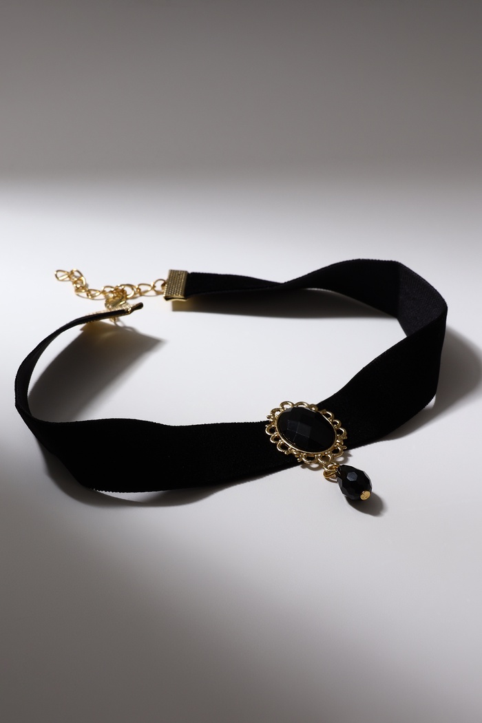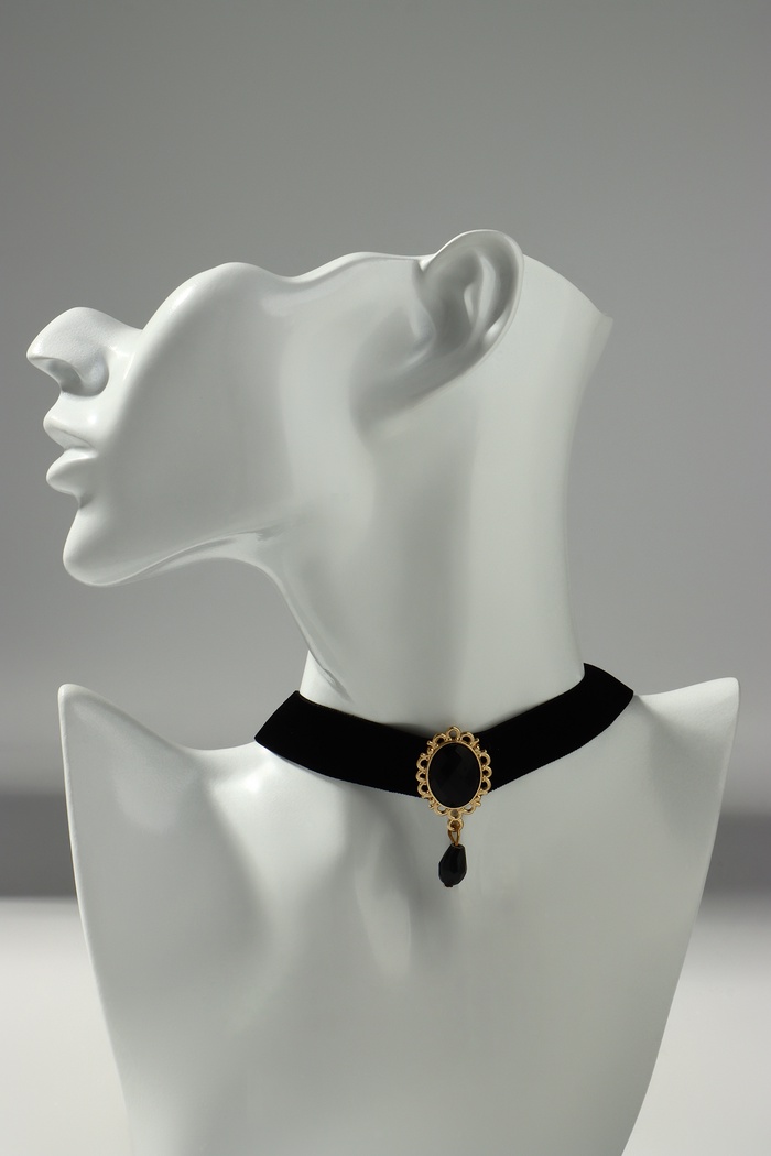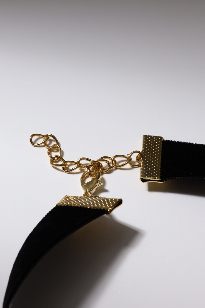 Чёрный чокер длиной 30 см — изысканное сочетание текстильной основы и металлических вставок с золотистым оттенком. Его ажурный дизайн с овальной формой привлекает внимание своей утончённостью и оригинальностью, подчёркивая индивидуальность и стиль каждой женщины.