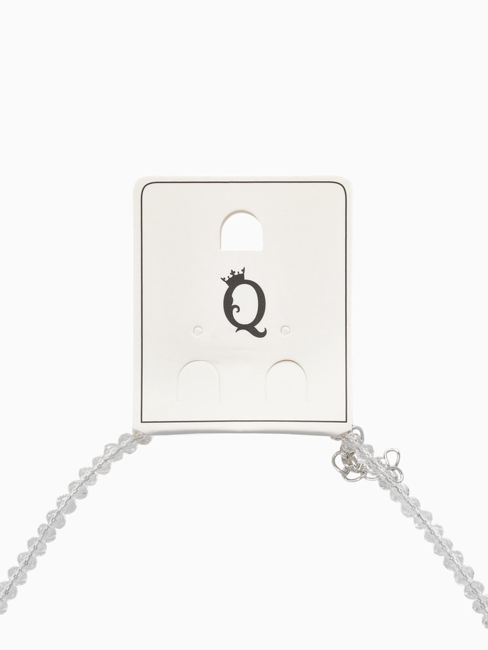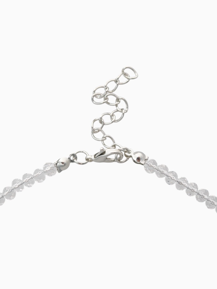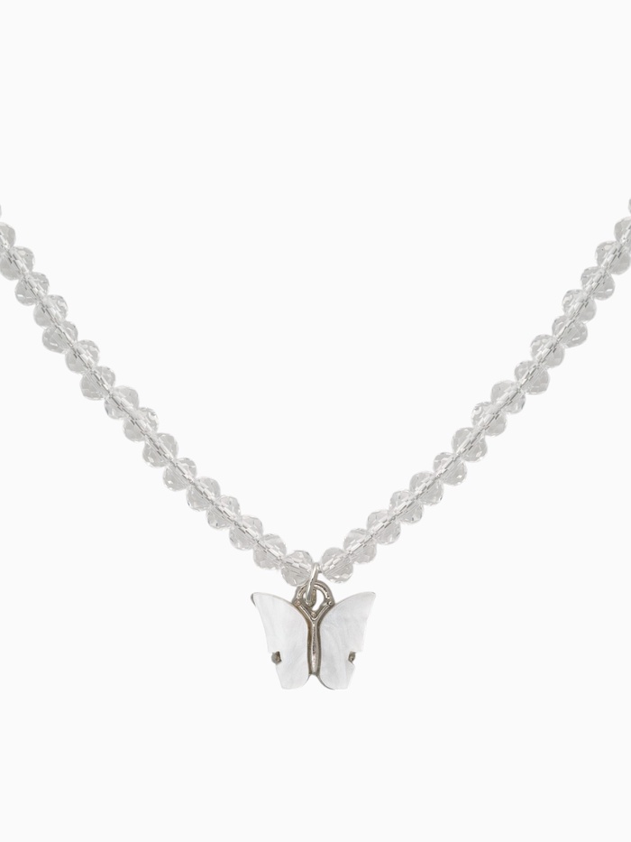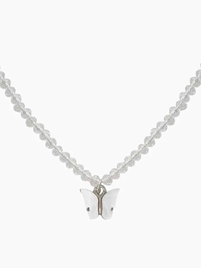 Чокер выполнен из высококачественного стекла, покрытого серебристым напылением, что создаёт эффект хрусталя, мерцающего при свете. Центральным элементом композиции выступает фигурка бабочки, исполненная в технике полистоуна, придавая изделию объем и реалистичность. Нежные переливы белых камней добавляют дополнительный шарм и позволяют украшать собой любой наряд.