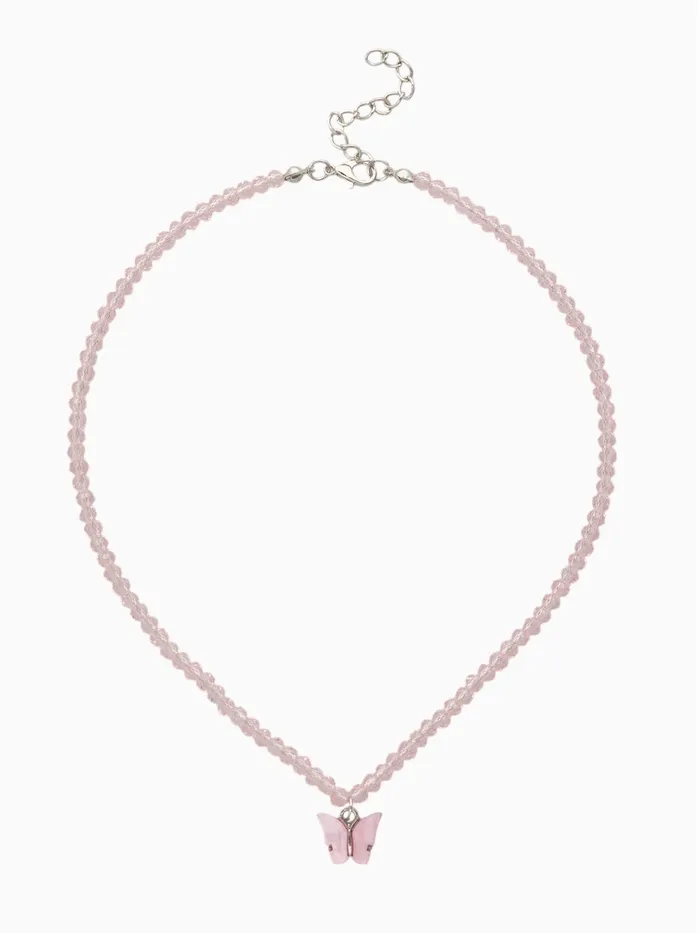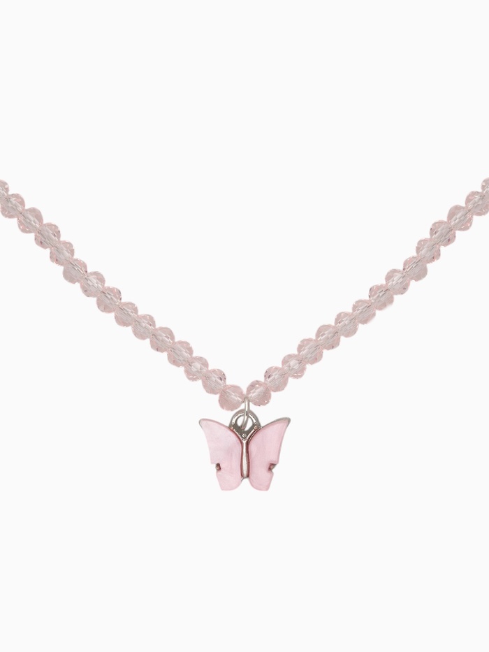 Акцентом изделия служит декоративная деталь в форме бабочки, изготовленная из прозрачного стекла с эффектом хрусталя, усиливающая сияние украшений. Прозрачность и воздушность придают этому элементу дополнительную глубину и изысканность. Гармоничный союз нежно-розового оттенка и серебристых аккордов визуально усиливает впечатление свежести и элегантности, отлично сочетаясь с различными нарядами и оттенками кожи.