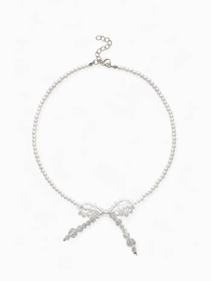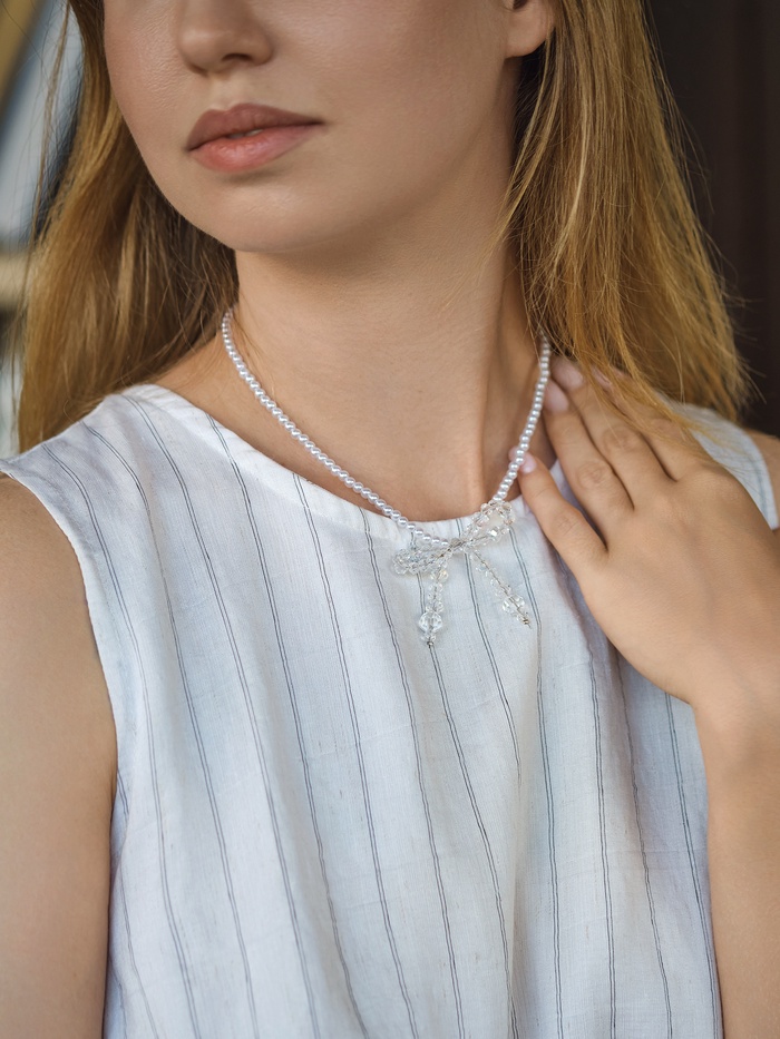 Белоснежный чокер длиной 33 см с дополнительной цепочкой в 5 см — воплощение утончённой нежности и лёгкости. Искрящиеся жемчужные бусины из стекла аккуратно собраны в изящный бант, который становится центральным акцентом украшения, создавая эффект воздушности и изящества без излишней вычурности.