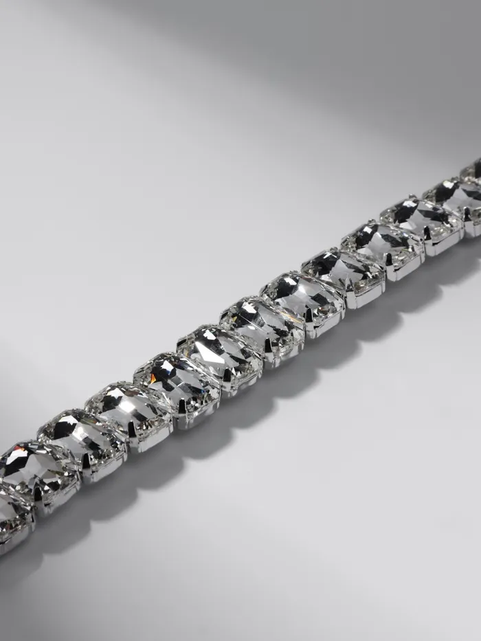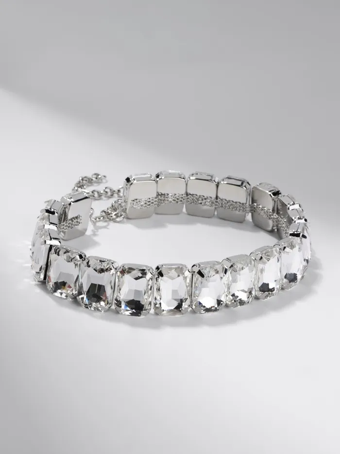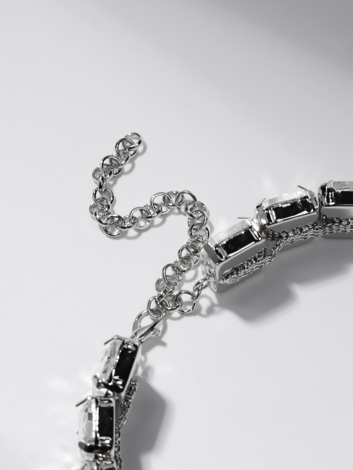 Это колье сочетает строгие линии металла и блеск страз, создавая эффект сияния без излишней вычурности. Оно легко впишется в повседневный гардероб и станет элегантным акцентом в праздничном образе, подчёркивая женственность и вкус.