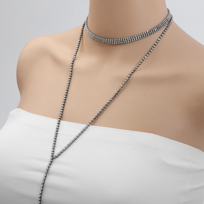 Трёхрядный чокер длиной 44,5 см с белыми стразами на основе из серого металла — воплощение современного шика и утончённой элегантности. Его многослойная структура создаёт эффект глубины и объёма, а холодный блеск камней подчёркивает изящество шеи, привлекая восхищённые взгляды.