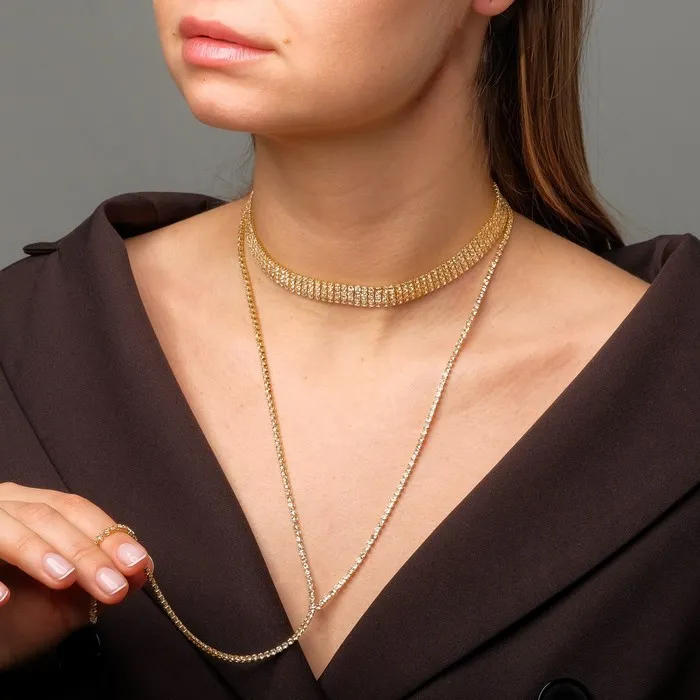 Этот чокер сочетает в себе простоту и блеск, добавляя образу утончённость без излишней пышности. Он поможет выразить индивидуальность и подчеркнуть настроение торжества или повседневной элегантности.