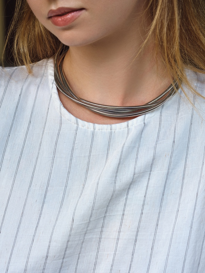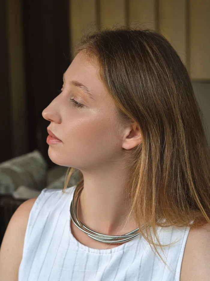 Сдержанный серебристый чокер-многослойник — воплощение современного минимализма и утончённого стиля. Его d=15 см идеально облегает шею, подчёркивая изящность и придавая образу лёгкую элегантность без лишних деталей.