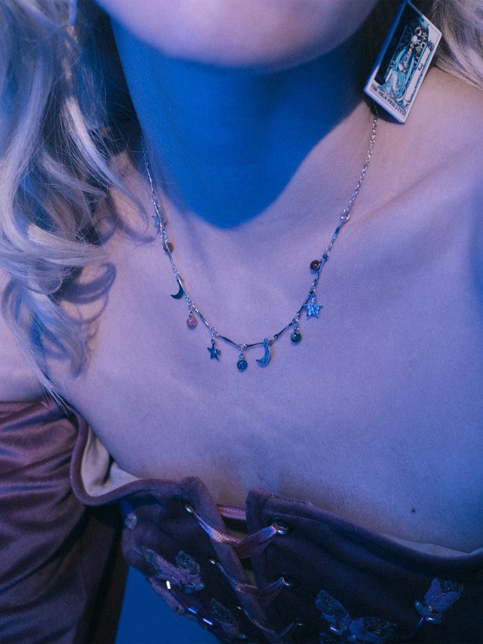 Украсьте свою шею магией ночных звёзд и лунного света с элегантным чокером, посвящённым фазам Луны. Эксклюзивное украшение позволит выразить свою любовь к астрономии и творчеству, привнесёт в ваш образ нотку таинственности и глубины.