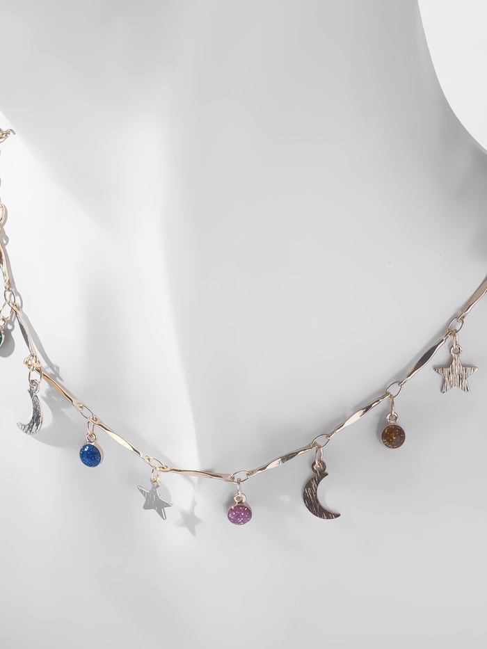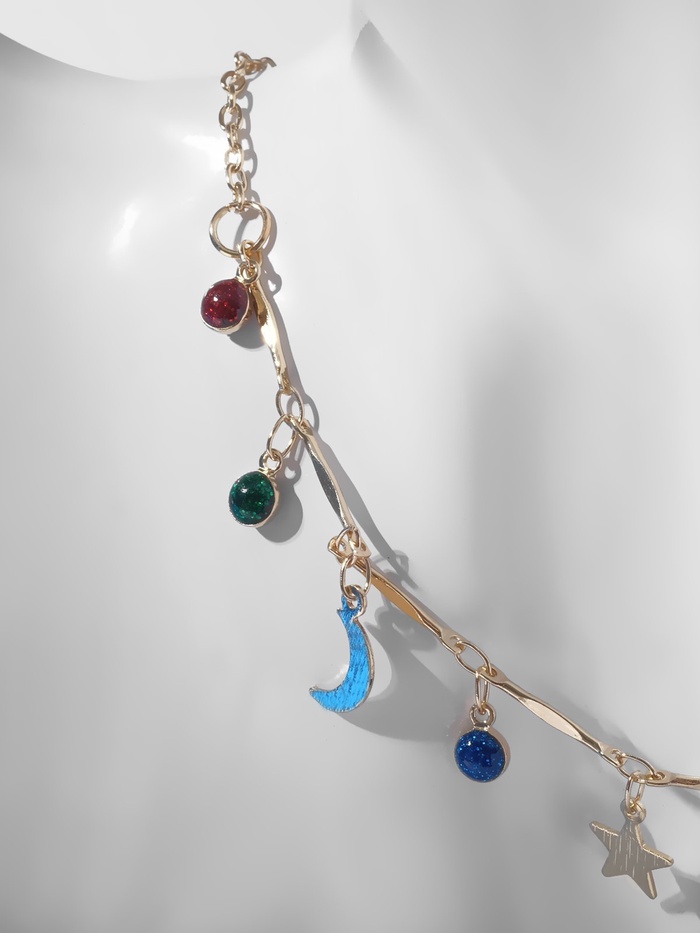 Этот чокер длиной 35 см объединяет в себе изящество и загадочность космоса, отражая фазы луны в ярком разноцветном исполнении на золотистой фурнитуре. Лёгкий и стильный аксессуар из бижутерного сплава с пластиковой подвеской станет эффектным дополнением к любому образу, привнося нотки мистики и современного шика.