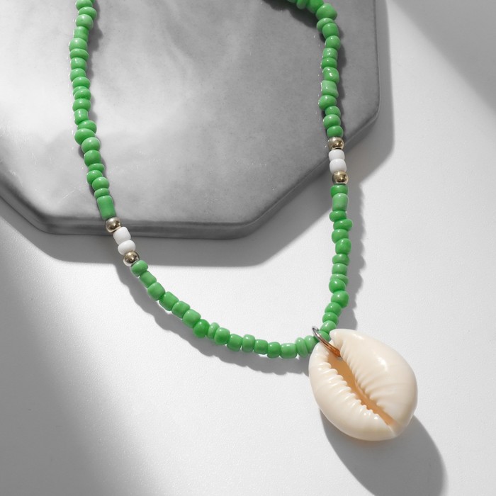 Лёгкий чокер длиной 42 см с одной ниткой в бело-зелёных тонах воплощает свежесть морского стиля и нежность природных оттенков. Украшение выполнено из пластика с вставками в виде ракушек и дополнено золотистой фурнитурой, что придаёт ему изысканность и современную лёгкость.
