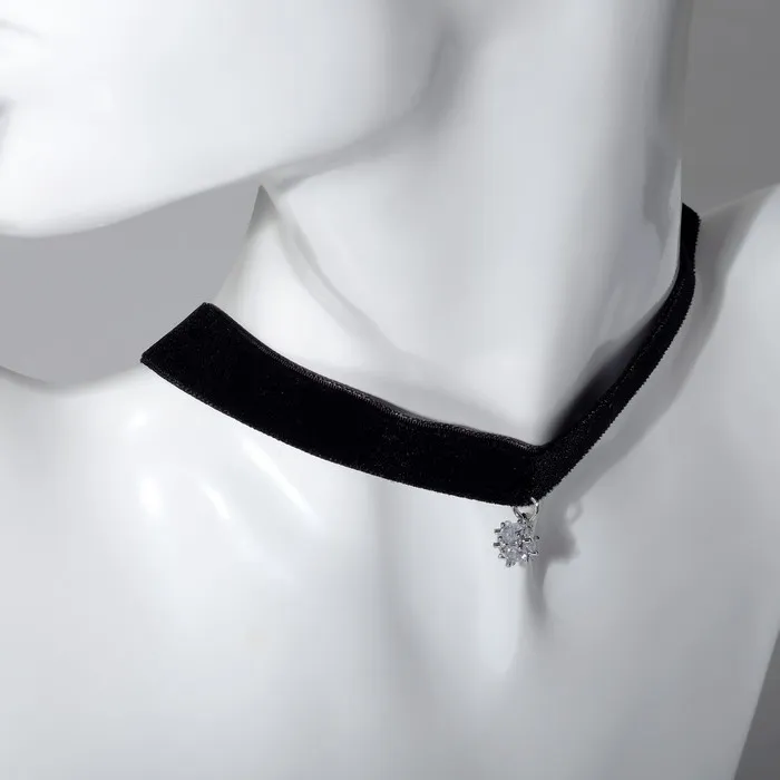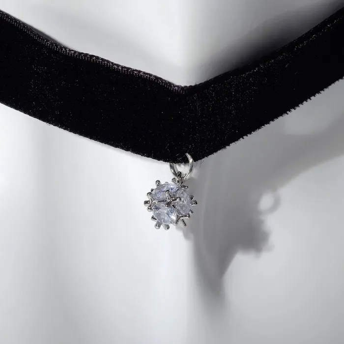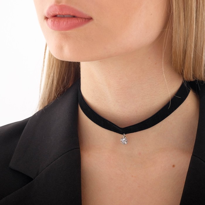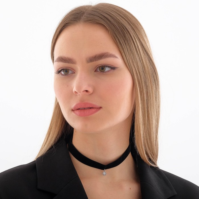 Лаконичный чокер длиной 33 см сочетает в себе стиль и утонченность благодаря текстильной основе чёрного цвета и изящным вставкам из страз и металла. Геометрический ромбовидный мотив с серебристой фурнитурой придаёт украшению современный и элегантный вид, подчёркивая индивидуальность и вкус своей обладательницы.