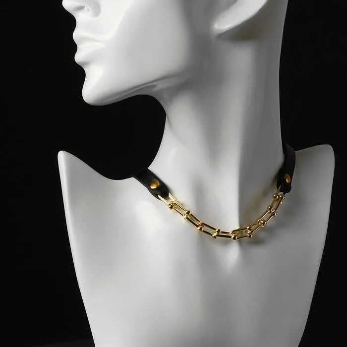 Чокер длиной 41 см сочетает в себе современный стиль и изысканную элегантность благодаря искусственной коже чёрного цвета и эффектной золотой металлической фурнитуре. Однослойный дизайн с акцентом на цепочку придаёт образу выразительность и подчёркивает индивидуальность, создавая гармоничный баланс между смелостью и утончённостью.