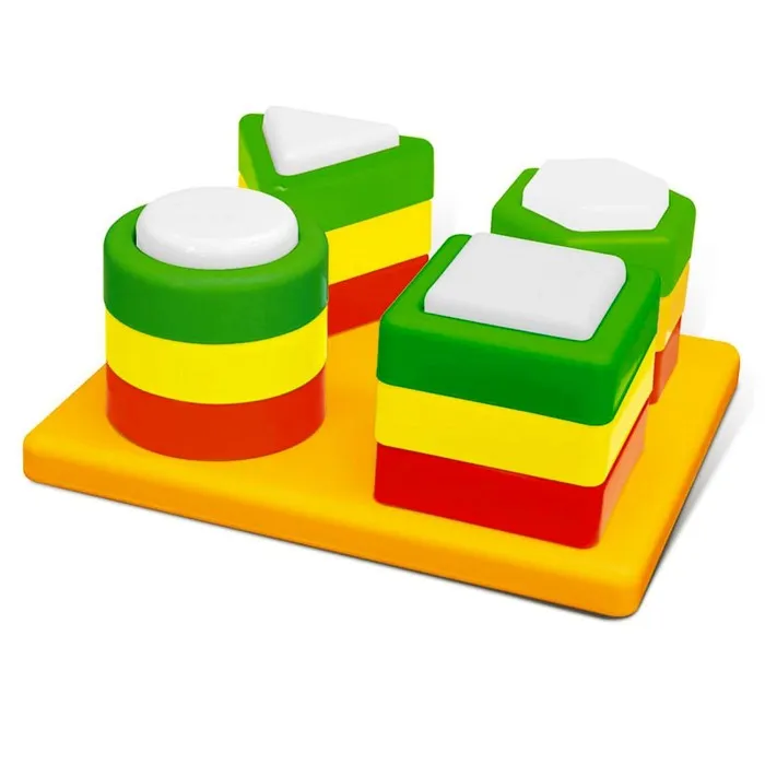 Малышам будет интересно перебирать и крутить фигуры в ладошках, надевать их на пальцы, складывать в мешочек и греметь. Они также могут нанизывать их на шнурок или поясок. Когда ребёнок освоится, его можно научить собирать пирамидки, подбирая фигуры и столбики.