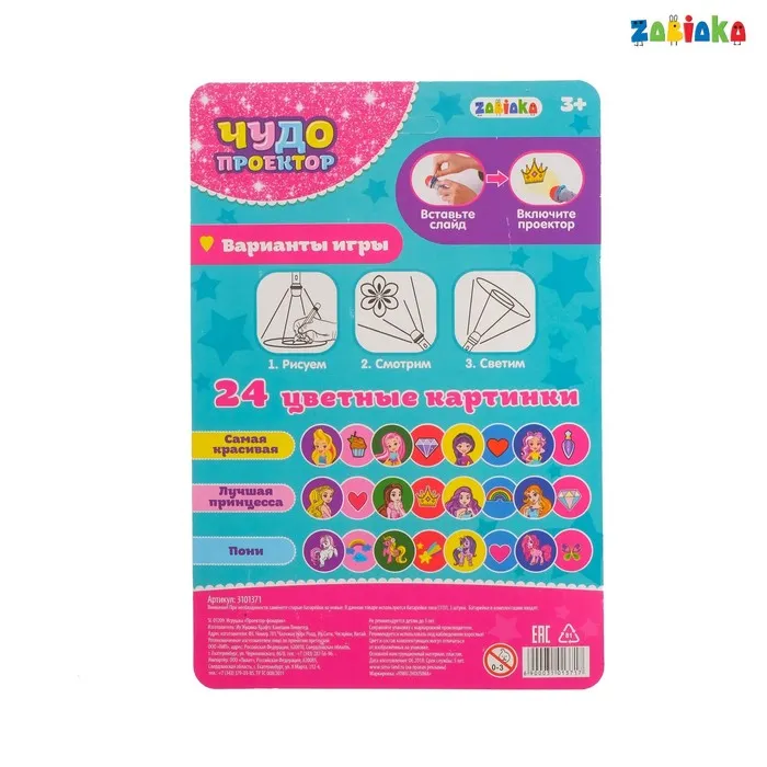 В набор входят: проектор-фонарик и 3 слайда (24 цветные картинки).