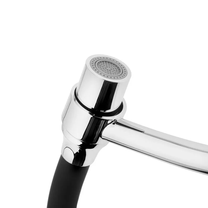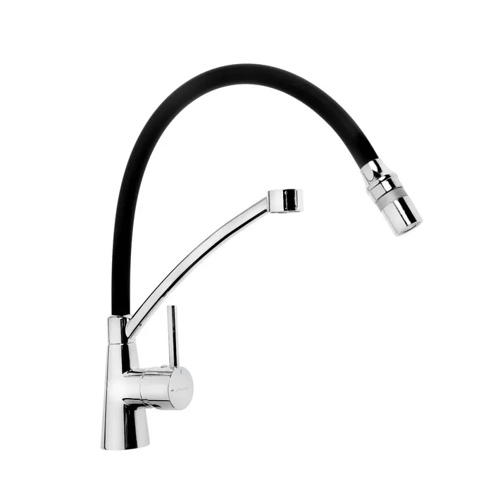- Дизайн: Гибкий силиконовый излив и корпус из латуни в черно-хромированном исполнении добавляют современный вид вашей кухне.