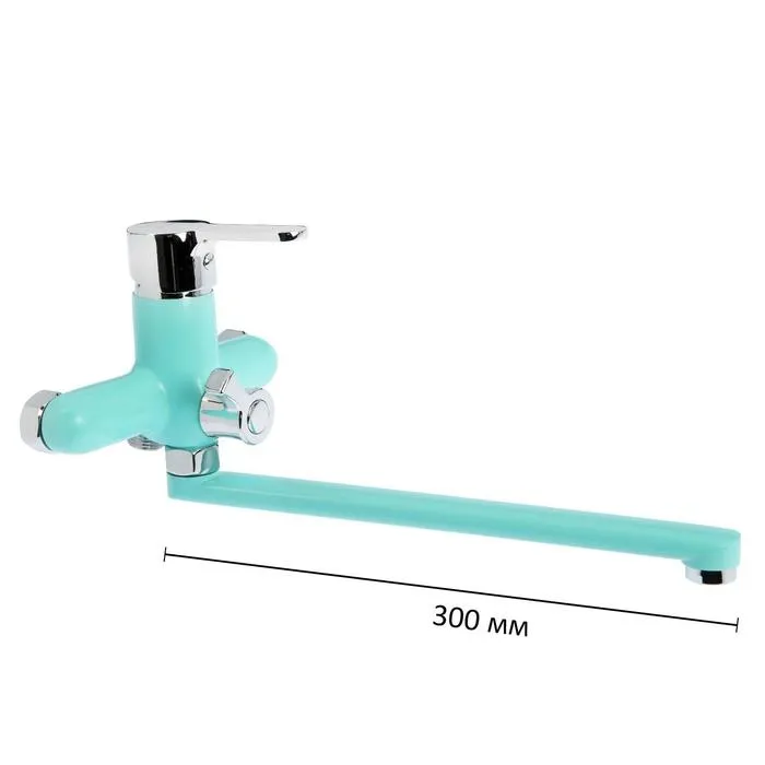 Настенный смеситель имеет длинный поворотный излив и рычаг для регулирования подачи воды. Режим «Душ» переключается поворотом вентиля. Сантехника выполнена в синем цвете.