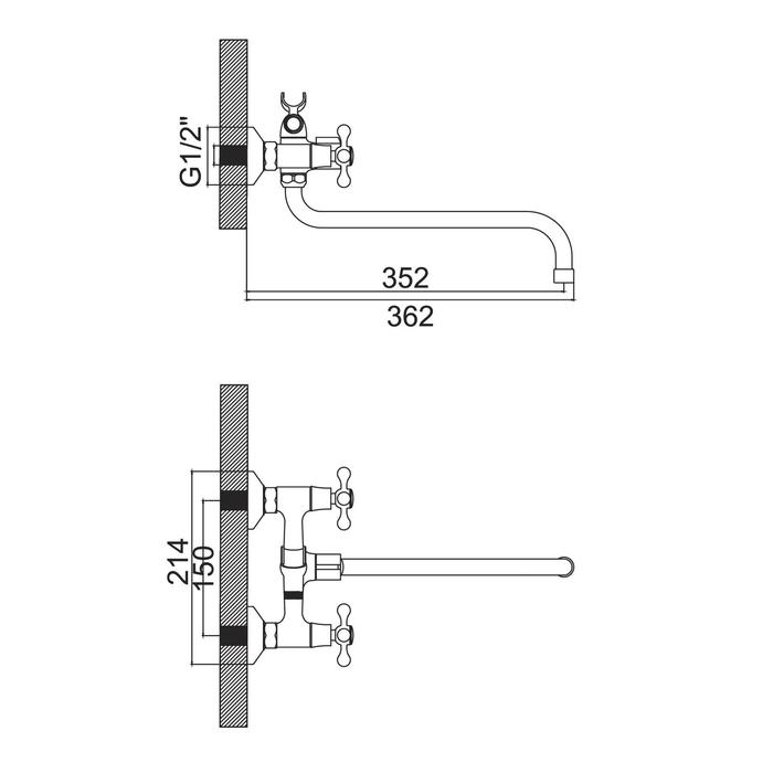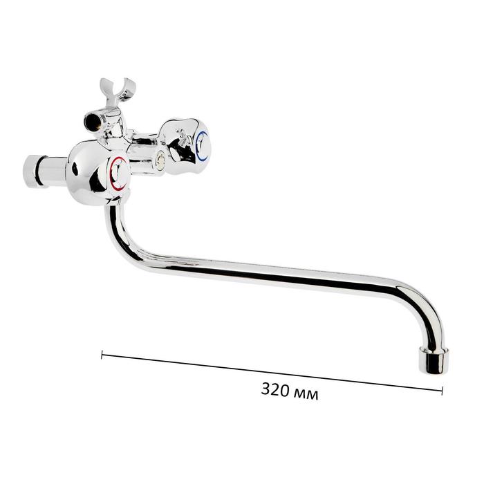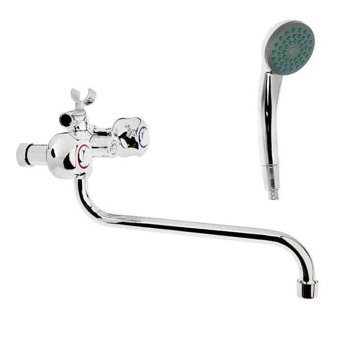 Смеситель имеет длинный поворотный излив и 2 вентиля для регулирования подачи воды. Режим «Душ» переключается поворотом рычага. Сантехника устанавливается на стену.