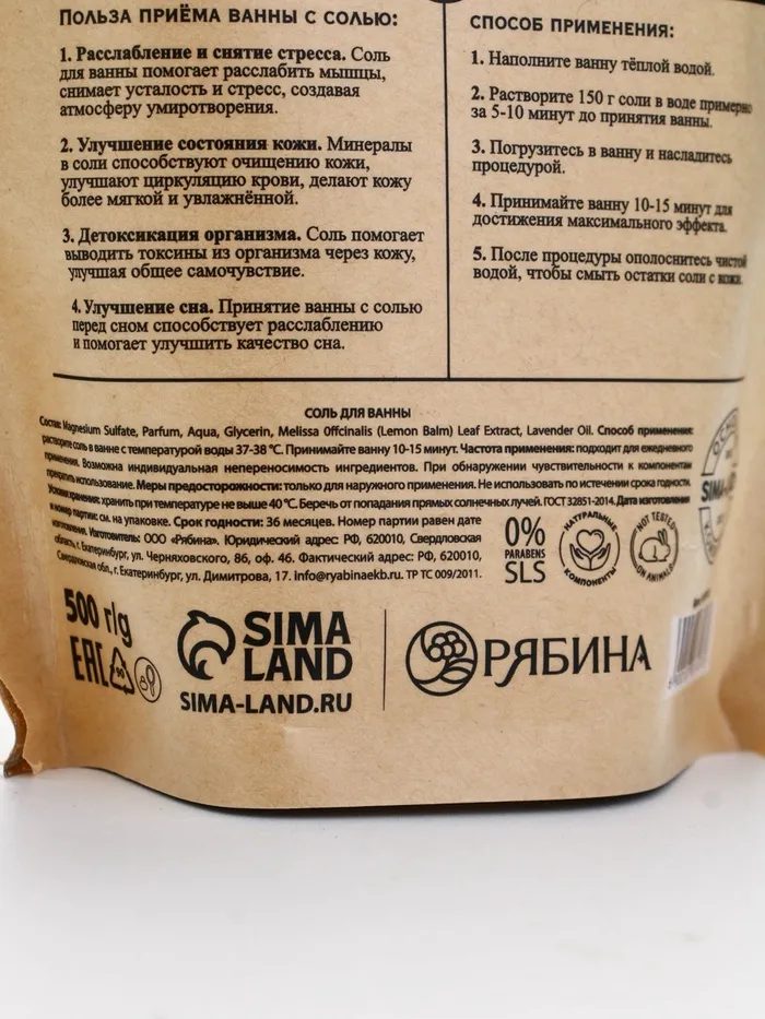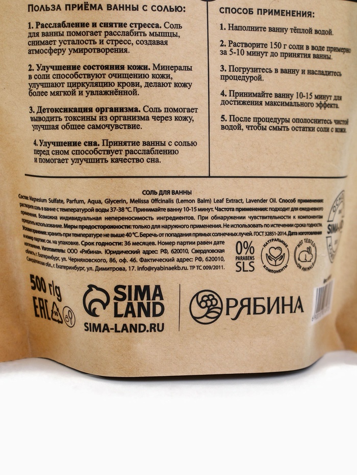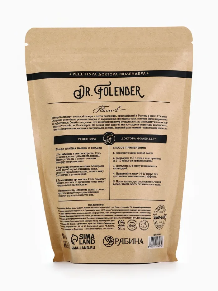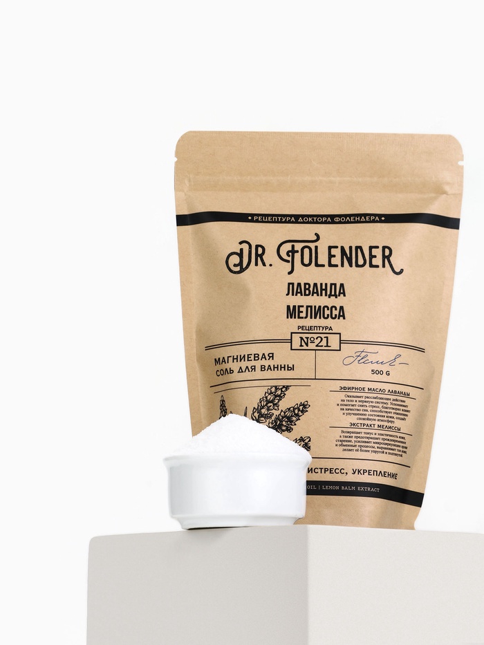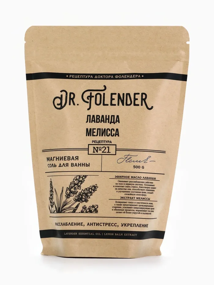 Cоль для ванны магниевая, с эфирным маслом лаванды и экстрактом мелиссы, 500 г, Dr.Folender — Характеристики