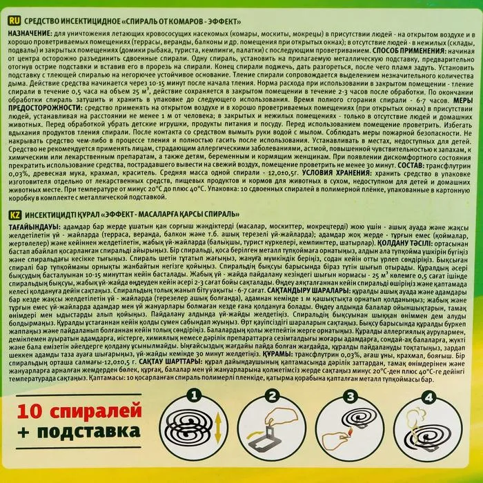 ОписаниеСпирали малодымные от комаров ARGUS предназначены для уничтожения комаров и других летающих насекомых (мошки, мокрецы, москиты) на открытом воздухе (сад, приусадебный участок, беседка, открытая терраса, веранда) в присутствии взрослых людей, а так же в закрытых помещениях в отсутствии людей.Тление спирали сопровождается выделением незначительного количества дыма. Резерв спирали весом в 13г - 7 часов. Гибель комаров в помещении начинается через 1-2 минуты и достигает 100% через 10-15 минут.Способ примененияВскрыть упаковку, достать спираль, поместить ее на прилагаемую металлическую подставку или на невоспламеняющуюся поверхность (металлическая крышка, блюдце, пепельница), поджечь, пламя задуть и оставить дымить до достижения нужного эффекта, поместив с подветренной стороны. После полной гибели комаров и других насекомых спираль можно затушить и сохранять для дальнейшего использования. Состав: действующее вещество – d-аллетрин (0,20%), краситель, окислитель, консервант.