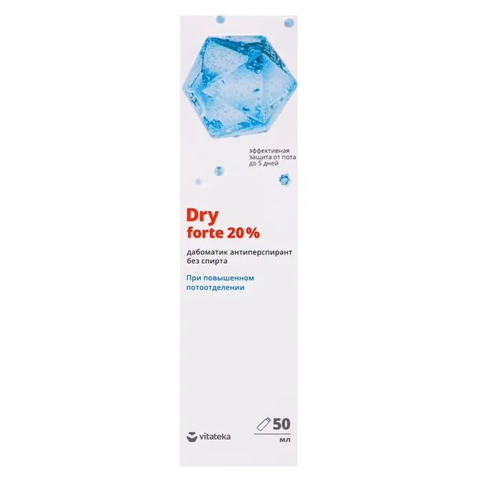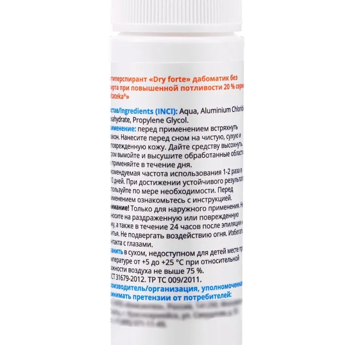 Описание: антиперспирант на водяной основе, позволяет значительно снизить и при регулярном применении остановить избыточное потоотделение, обеспечивает эффективную защиту от пота до 5 дней. Антиперспирант DRY является безопасным и эффективным средством. В основе действия антиперспиранта лежит взаимодействие гексагидрата хлорида алюминия с кожным белком, в результате чего происходит формирование алюминиево-белкового комплекса, обеспечивающего сужение протоков потовых желез. Формула средства обеспечивает безопасность его использования за счет нерастворимости и полного выведения алюминиево-белковых соединений из организма по окончании использования антиперспиранта. При использовании DRY функции потовых желез не нарушаются. В организме происходит равномерное перераспределение выделения пота через другие участки тела.