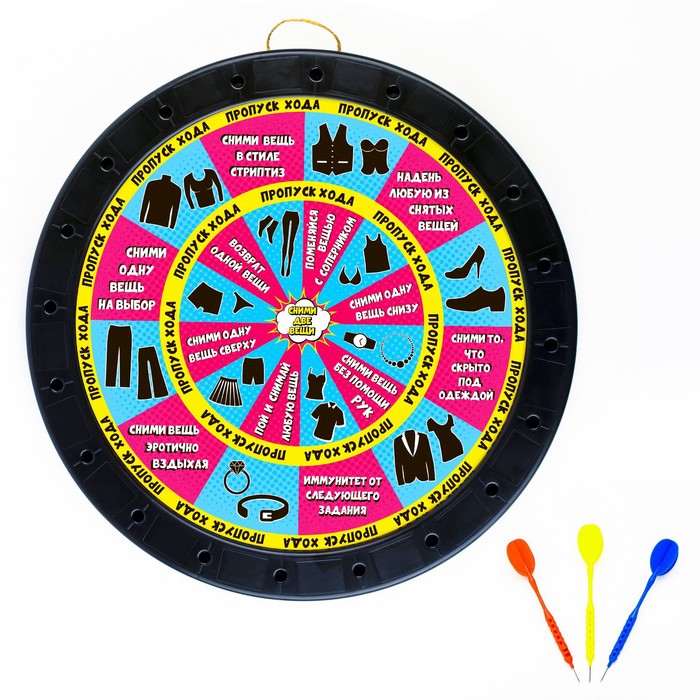 Цель игры – раздеть соперника! Играть можно вдвоём либо, разделившись на команды. Участники по очереди бросают дротики. При попадании в определённый сектор, задание выполняет соперник или любой из игроков противоположной команды. При попадании в сектор с предметом одежды, любой игрок из команды соперника снимает выпавший предмет одежды. При промахе ход переходит сопернику. Проигрывает команда, которая первая окажется раздетой или откажется раздеваться дальше.