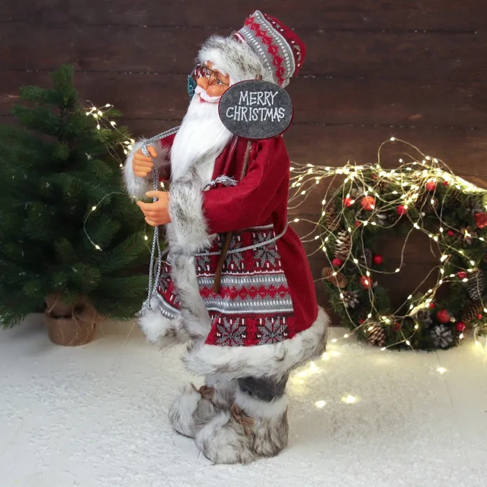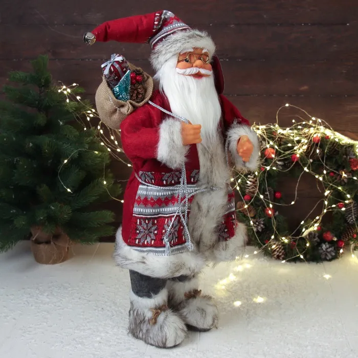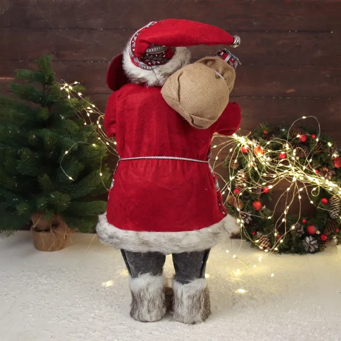 Дед Мороз в красной шубке с орнаментом и подарками станет замечательным акцентом среди праздничного декора. Этот персонаж органично дополнит пространство под ёлкой, на полке или в фотозоне.