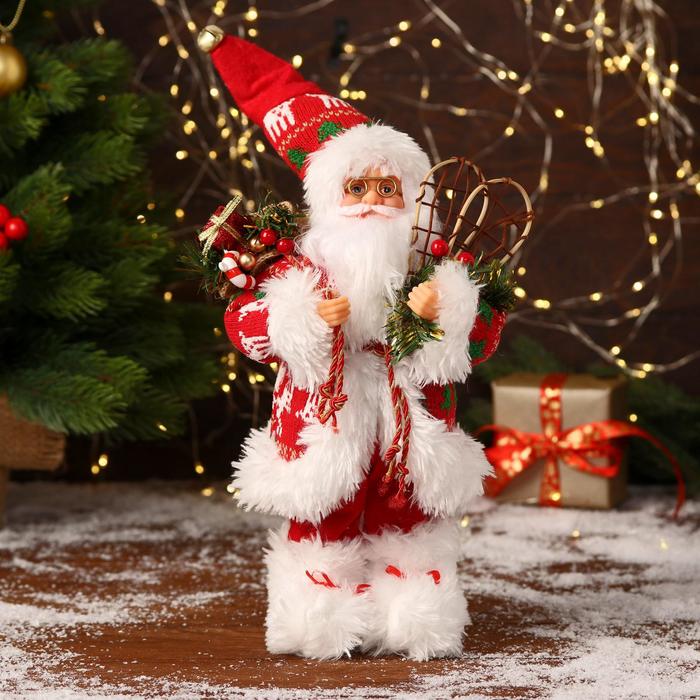 Фигурка Деда Мороза на санях — красно-белый аксессуар для новогоднего декора, который воплощает зимние традиции. Он подходит для размещения под ёлкой в стилях новогоднее барокко, скандинавский или фьюжн.