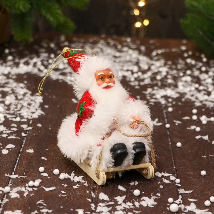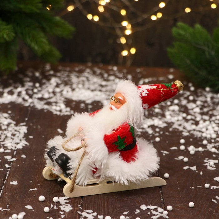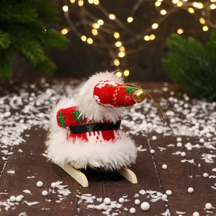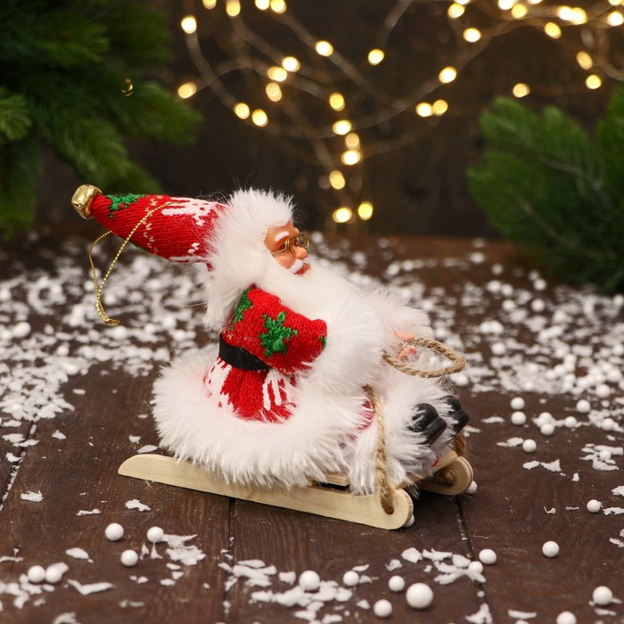 Дед Мороз под ёлку «Зимнее волшебство. В костюмчике с узорами и мехом, на санях», 13 см, красно-белый — Характеристики