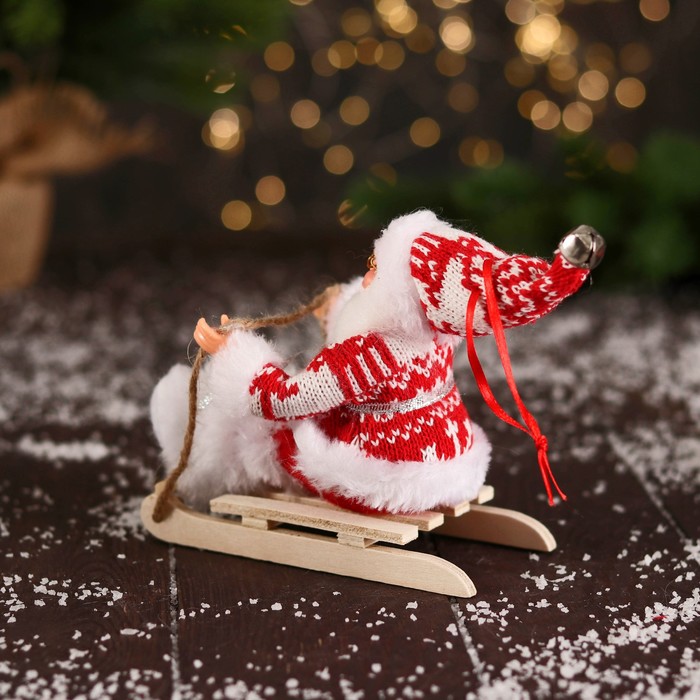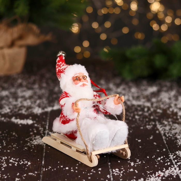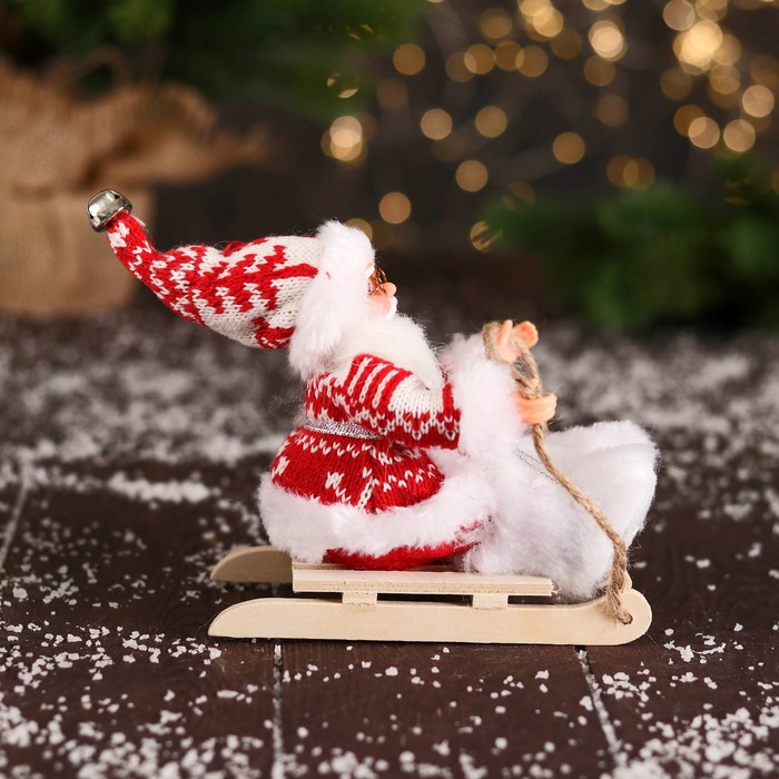 Дед Мороз под ёлку «Зимнее волшебство. В костюмчике с узорами и меховых ботиночках, на санях», 13 см, красно-белый — Характеристики