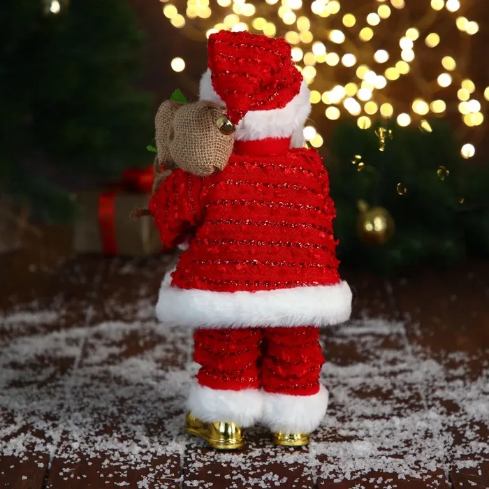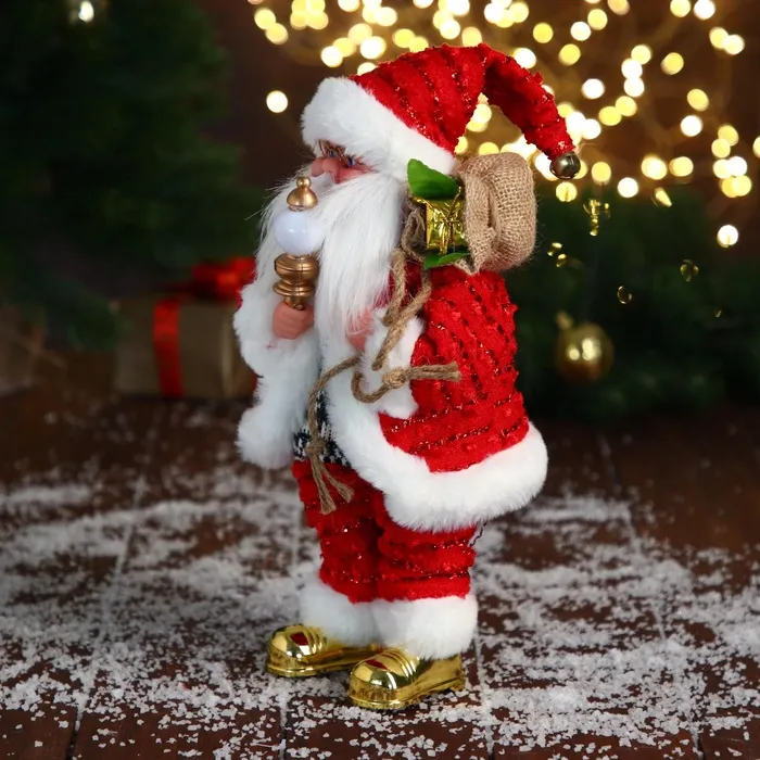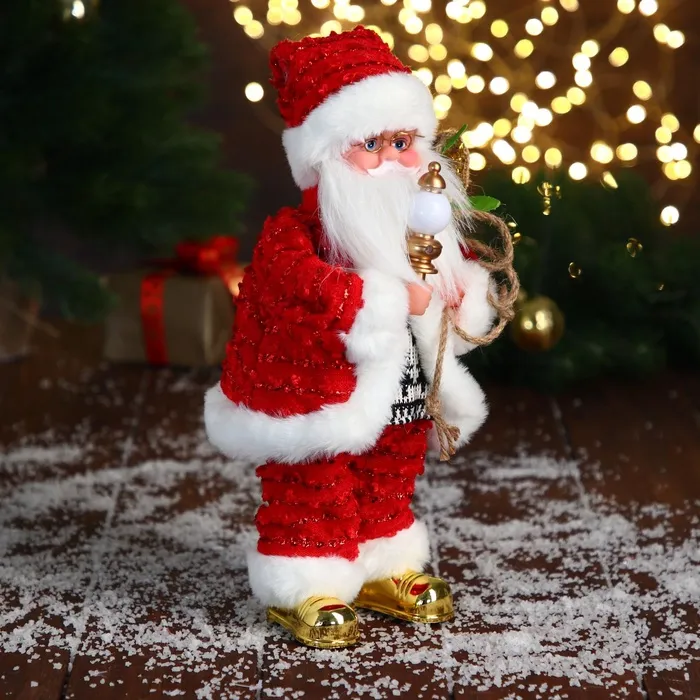 Дед Мороз под ёлку «Зимнее волшебство. В свитере и блестящей шубке» двигается, лампа светится, 30 см — Характеристики
