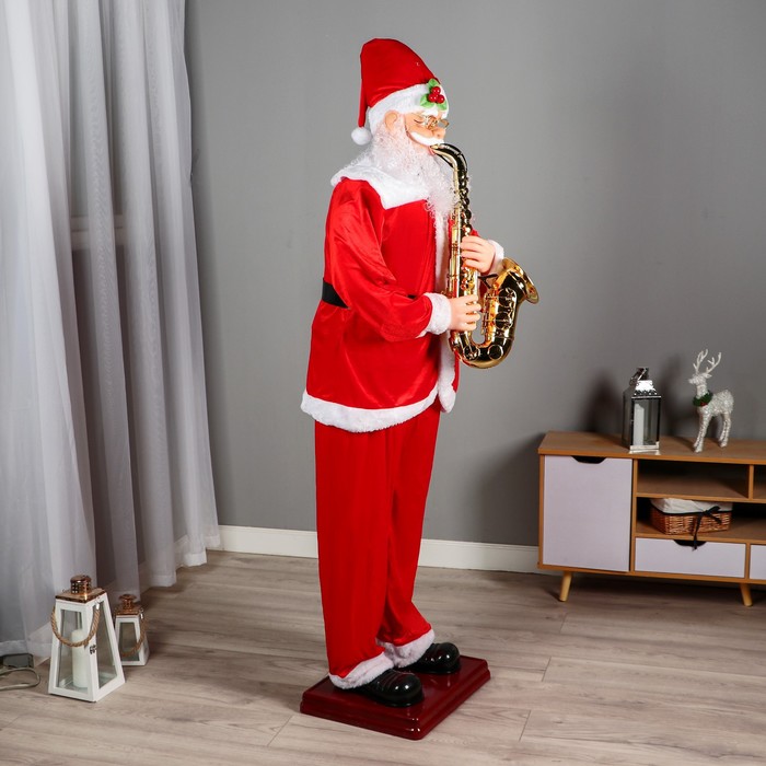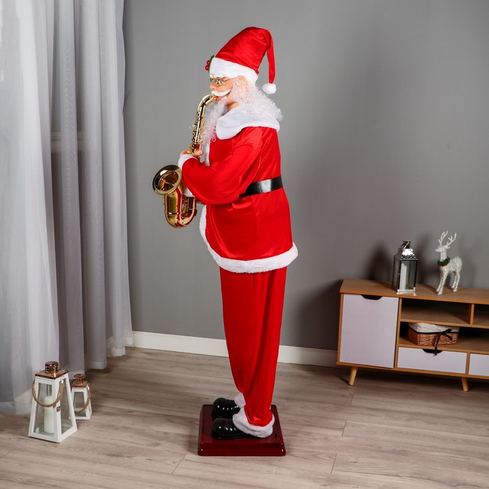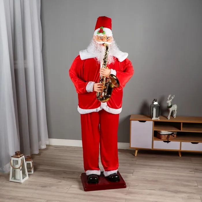 Дед Мороз "С саксофоном и украшением на колпаке" реакция на движение, 180 см, красный — Характеристики