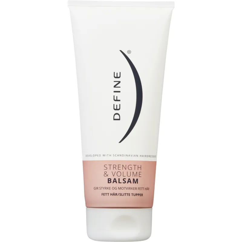 Кондиционер Define Strength & Volume придаёт волосам объём и одновременно укрепляет их. Он эффективно удаляет жирность и остатки стайлинговых средств с волос и кожи головы. Этот кондиционер является веганским и не содержит силиконов. Линейка продуктов Define разработана в сотрудничестве со скандинавскими парикмахерами.