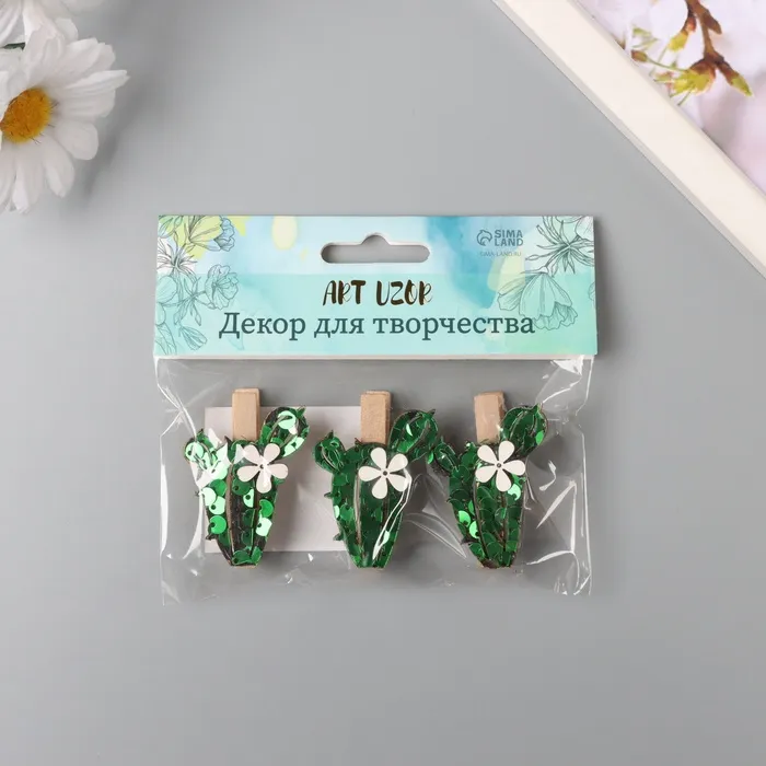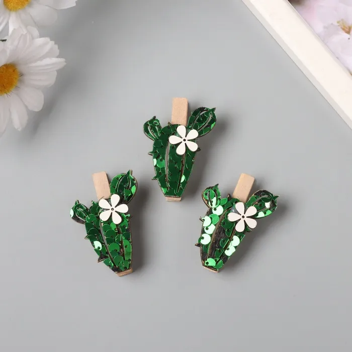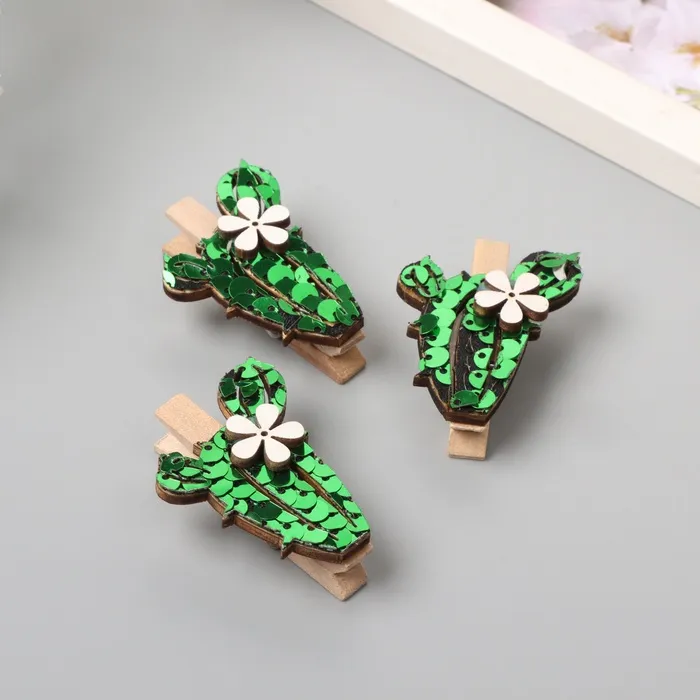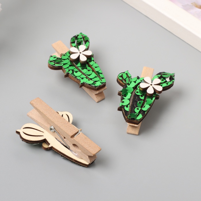 Декор для творчества дерево «Прищепка. Длинный кактус», пайетки, набор 3 шт., 1.5×3.4×4.8 см