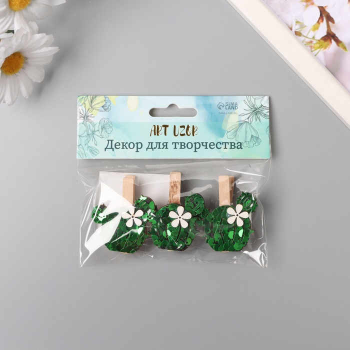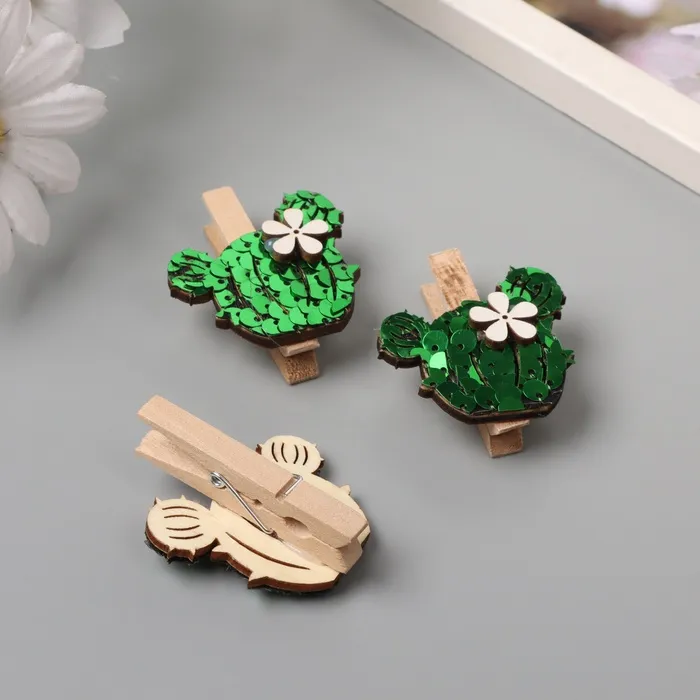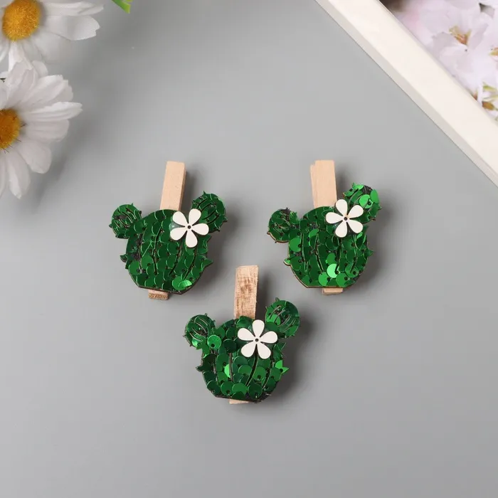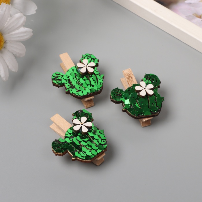 Декор для творчества дерево «Прищепка. Кактус с цветком», пайетки, набор 3 шт., 1.5×4×4.8 см